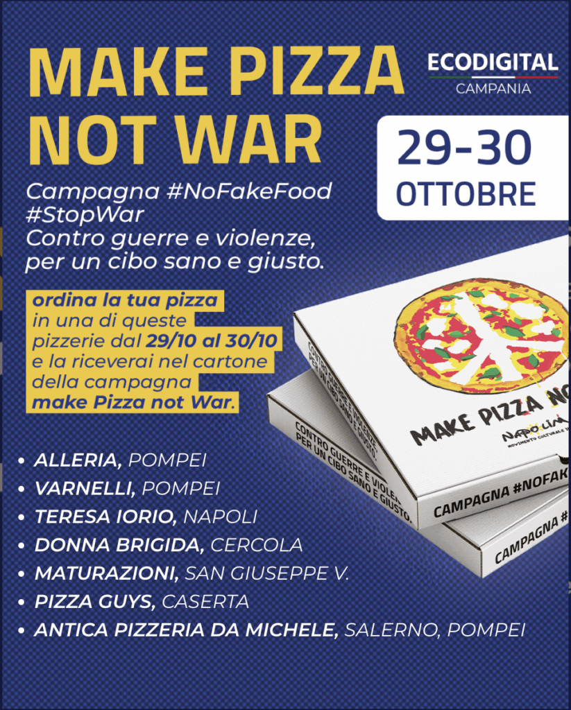 Campagna #NoFakeFood #StopWar, contro guerre e violenze, per un cibo sano e giusto. “MAKE PIZZA NOT WAR”, un’iniziativa che unisce i temi della pace e della qualità e autenticità del cibo, promossa sotto gli hashtag #NoFakeFood e #StopWar. L’iniziativa proseguirà il 29 e 30 ottobre 2025, quando nelle pizzerie aderenti verranno utilizzati, fino a esaurimento scorte, i cartoni […]